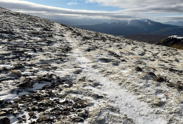 Looking across Loch Fannich to the North and East facing coires of Toll Mòr and Toll Beag on Fionn Bheinn. The light dusting of fresh snow can be seen on these slopes. Icy paths were a key feature when making todays observations and the same is to be expected for tomorrow.