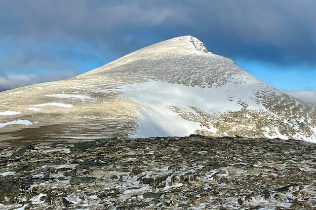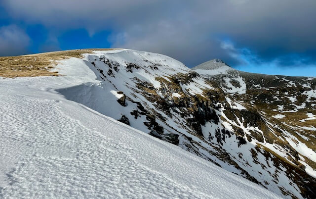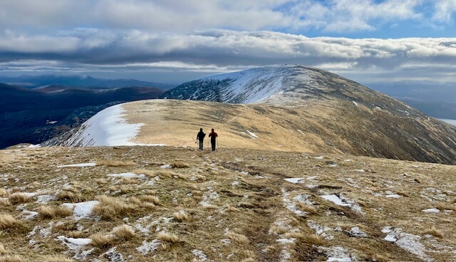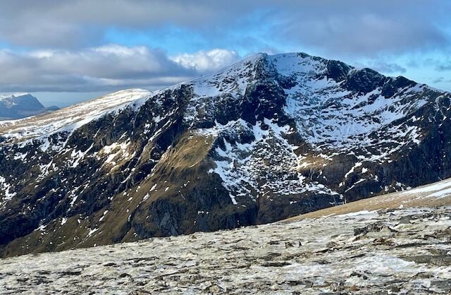 Looking across to Meall Gorm (949m). The light dusting of fresh snow can be observed on the low lying hills to the left of Meall Gorm. Always good to bump into folk out enjoying the hills. Goggles were kept on during this interaction due to the windchill and very light (but sore) drifting snow.