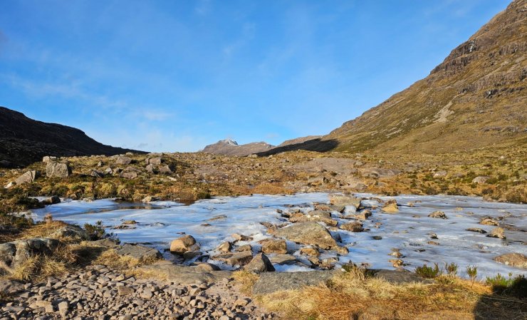 The Eastern facing Coir nan Laogh and Tom na Gruagaichand summit on Beinn Alligin, with the Southern slopes of Beinn Dearg, from Lochan a Choire Dhuibh, only partly frozen over.