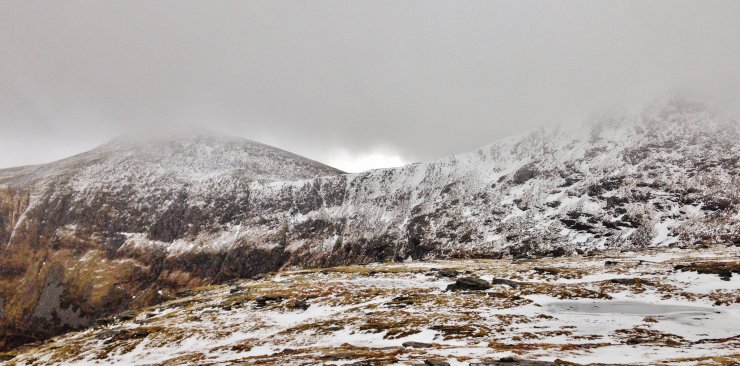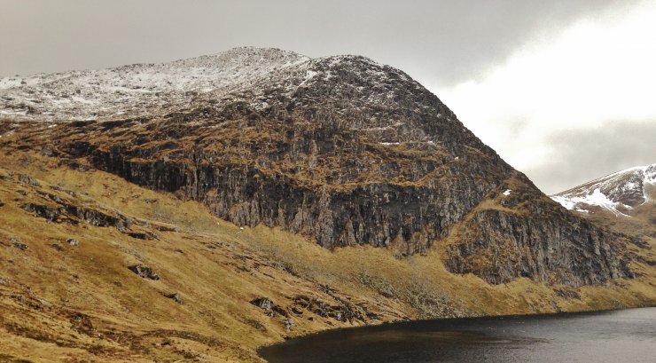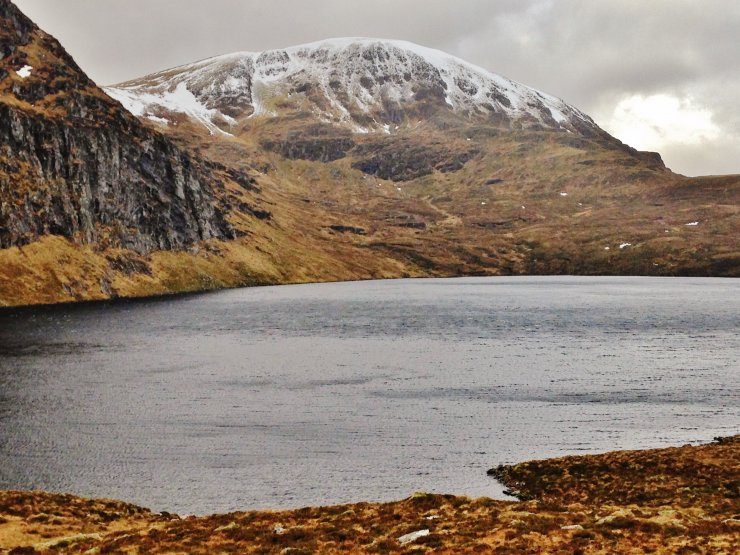(Above) A thin cover of most recent snow on the summit of Carn na Criche, 961m. The crags above the loch sport a few good ice climbs – when in condition….