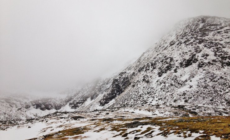 (Above) Snow cover on the east face of Sgurr Mor, with the start of north ridge on the right. I noted some rotten ice lingering at the start of the classic winter climb ‘Resurrection’.