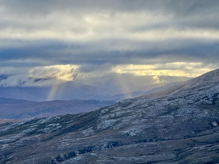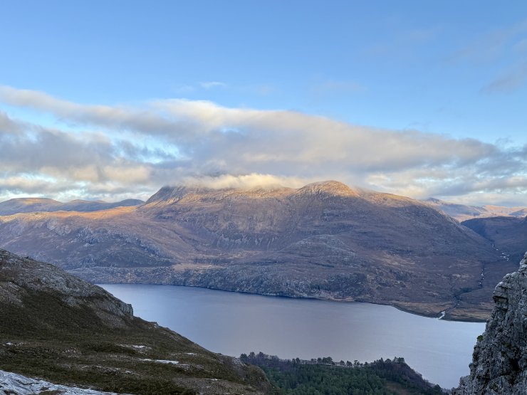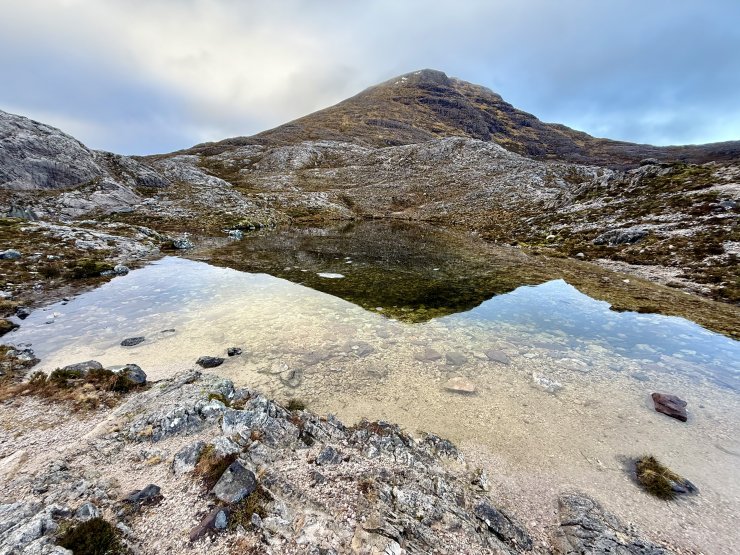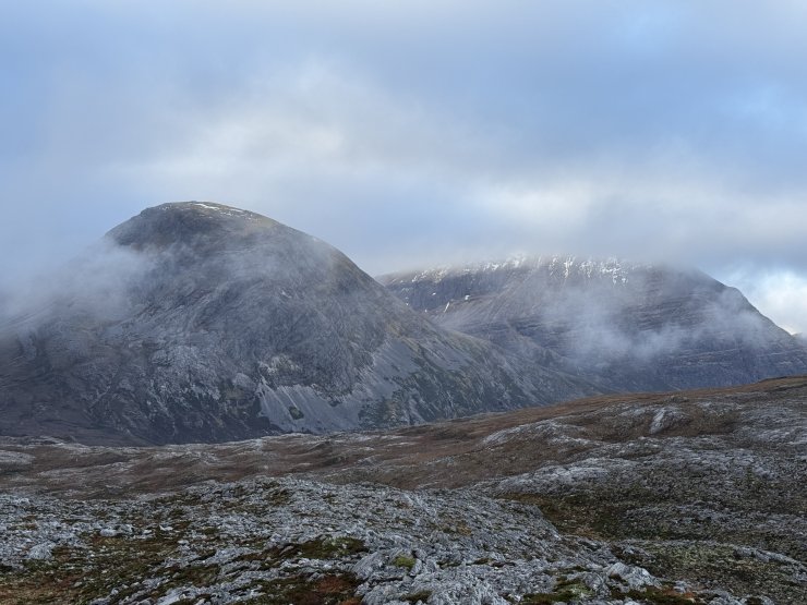 After a frost in the glen this morning there was another pleasant dry day, with stronger NE winds than of late. The dry air meant that above around 300m ice remained on the paths and the surface of lochans remained fully or partially frozen. Over Beinn Eighe the cloud base remained around 700-800m, but with enough breaks as it drifted across to give some views (and photo opportunities) onto Ruadh-stac Beag and Ruadh-stac Mor.