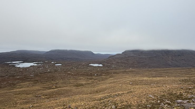 (Above) Beinn an Eoin (left) and Beinn a’ Chearcaill (right), and the layer of cloud (base c.600m) that drifted from the North onto Beinn Eighe during the late morning.