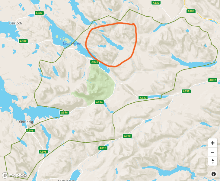 The map below shows the SAIS Torridon forecast area which is quite large. Most of the recent snow has fallen in the Fisherfield area and over towards Slioch. The Fannichs got slightly less and the hills around Glen Torridon got very little.