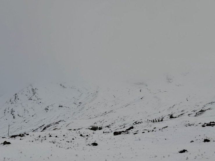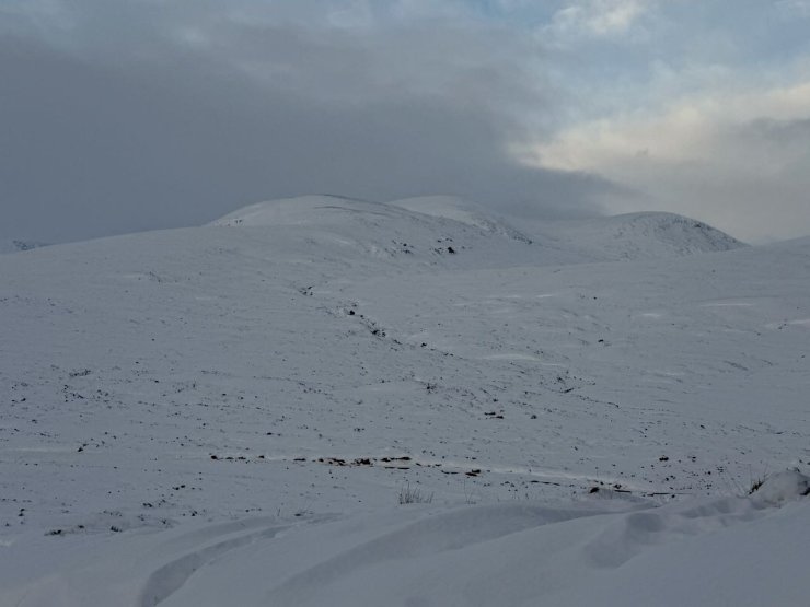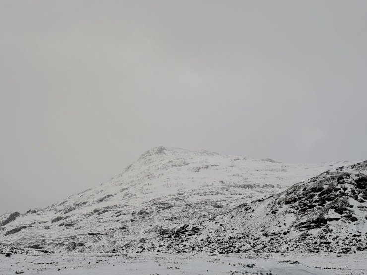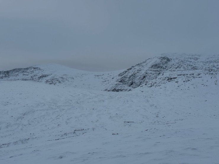 Observations today were from Beinn Liath Mhor in the Fannichs. A fine start gave some views of the snow in the Fannichs. However the cloud came in and snow above around 400 metres started from late morning. Stronger than expected South-Easterly winds gave drifting of both the existing and new snow. This drifting will continue through the night before the freezing level rises and gives a period of instability. Rain will continue for most of the day and into Monday before the freezing level drops again on Tuesday. Photos from the Fannichs are from before the weather deteriorated and are not what people may have experienced on the hill if you were out after midday. A couple of photos from a drive down Glen Torridon later in the day as well.