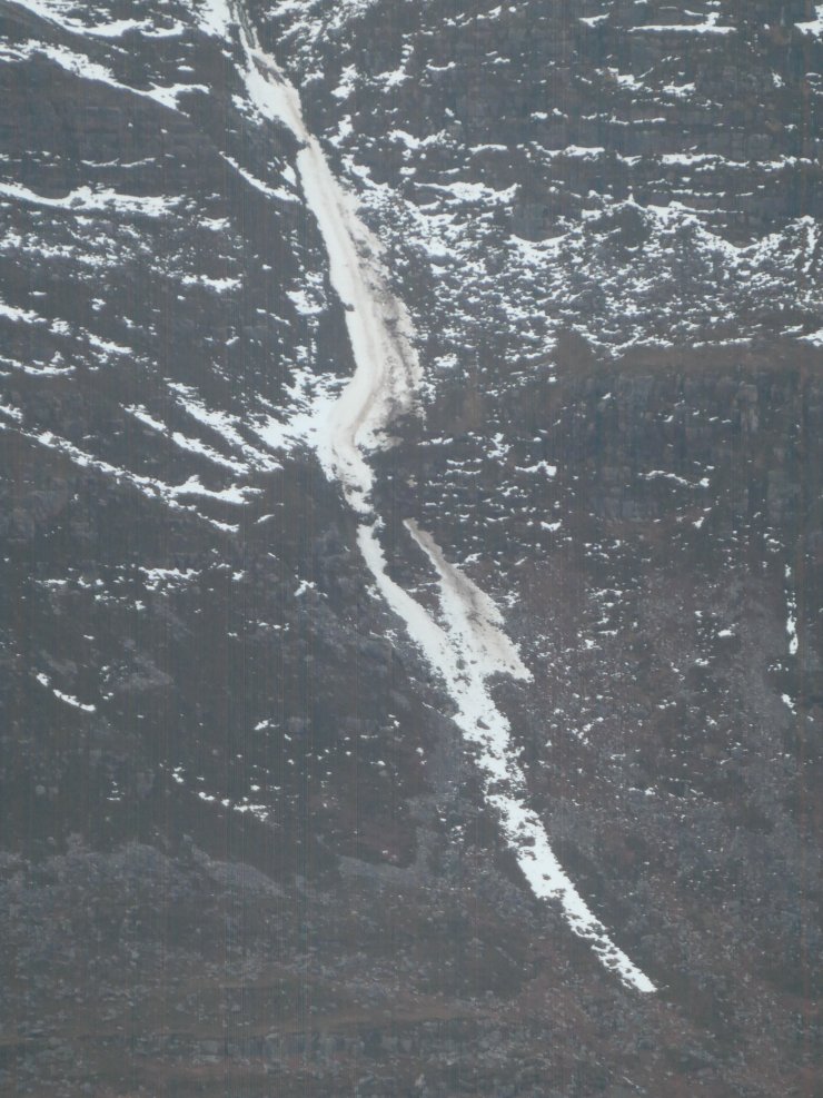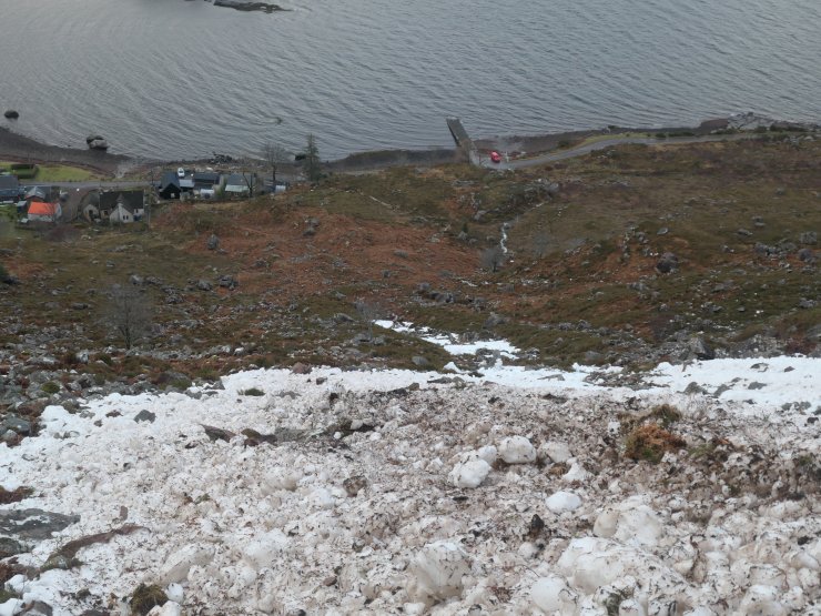 Wow, interesting shots of the avalanche above Torridon. I skied that gully on the morning of the 4th. I dug a pit halfway up and It was pretty much 2m of graupel. It was very hard to get any kind of column to stand on its own at all. Made for a great ski. I was wondering if in big winters of the past, the buildings would have been threatened by an avalanche from that gully. Particularly, the school right below!
