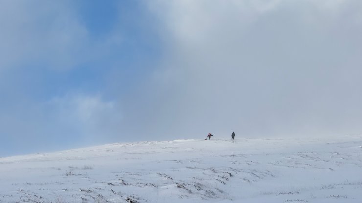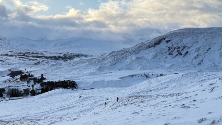 Looking up the lower slopes of Fionn Bhein at ski tourers during a rare clear spell