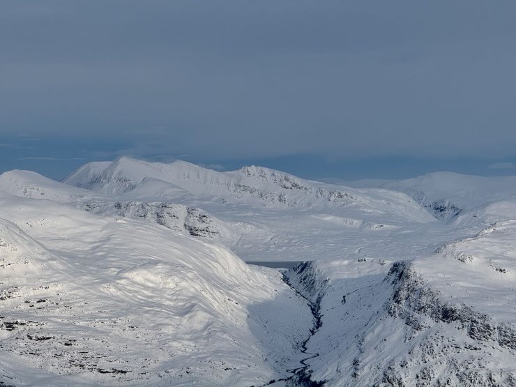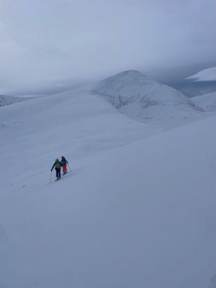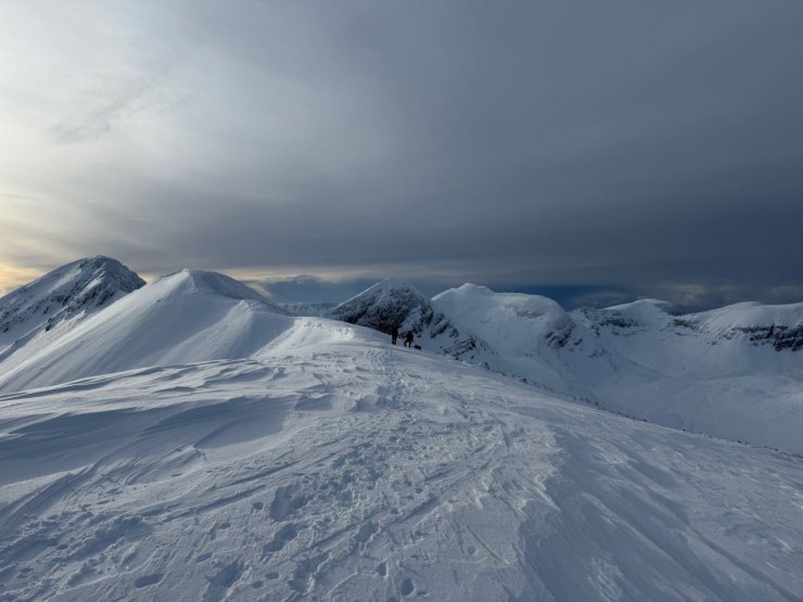 The summit ridge of Creag Dhubh Beinn Eighe with some cornices. Some of these have collapsed, it was useful to note they did not trigger any avalanches onto slope below when they collapsed.