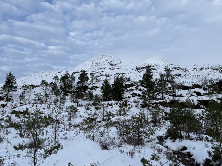 (Above) Deep snow in the pinewood just above the road from the Coire Mhic Nobuil car park. Tom na Gruagaich above.