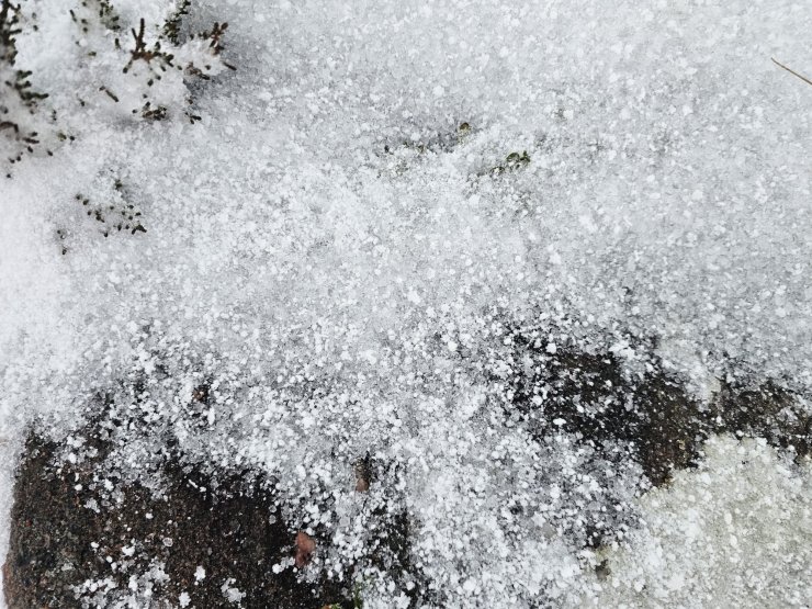 Soft graupel settling on the frozen ground, around 400 metres around the middle of the day.