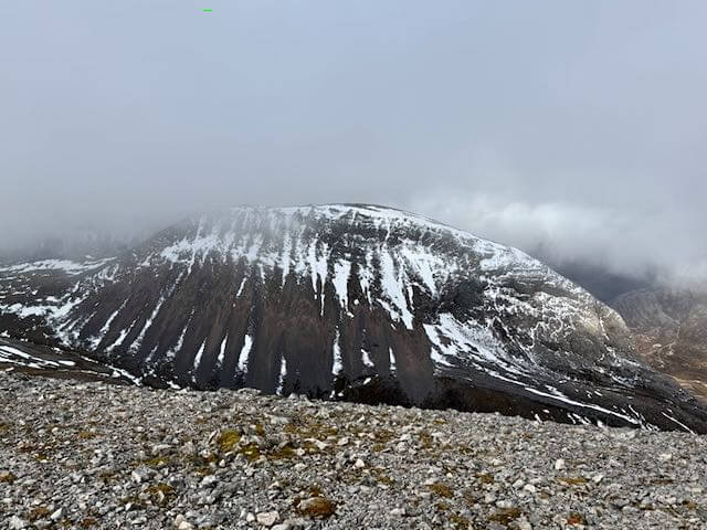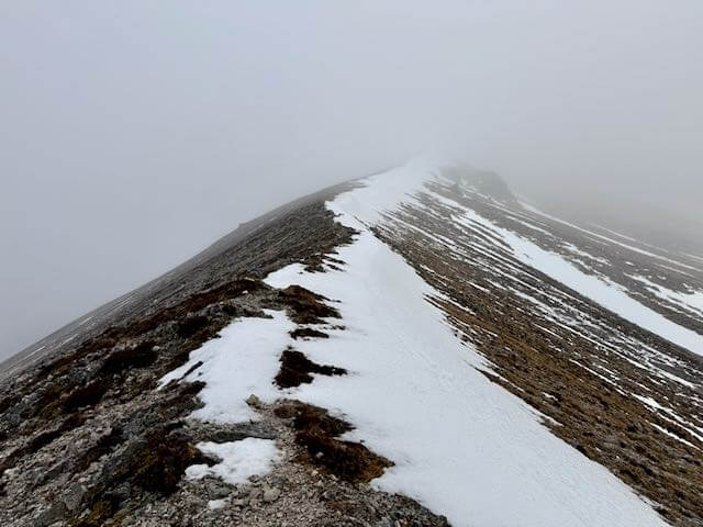 The ridge leading to the summit of Creag Dubh before the cloud lifted. Many ridges will be like this with snow on the more Easterly aspects and Westerly aspects nearly snow free.