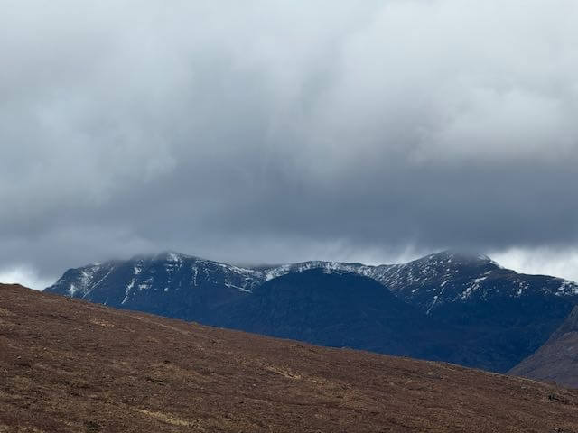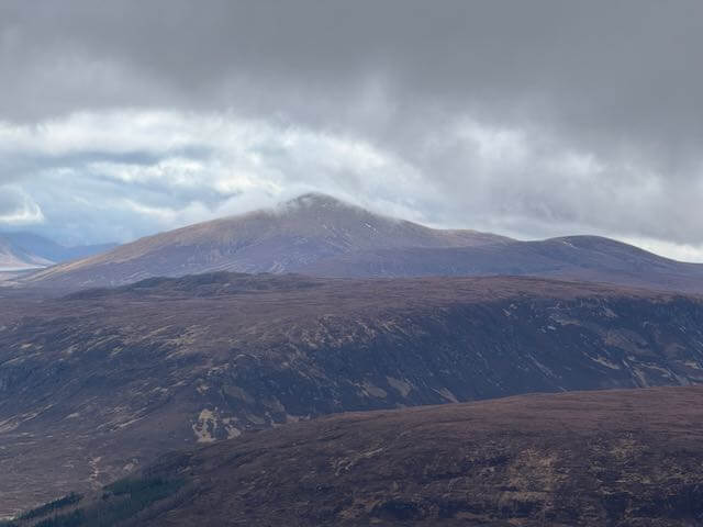 Fionn Bheinn with the South facing aspects nearly snow free. A brief glimpse of the Fannichs showed significantly more snow than on Fionn Bheinn.