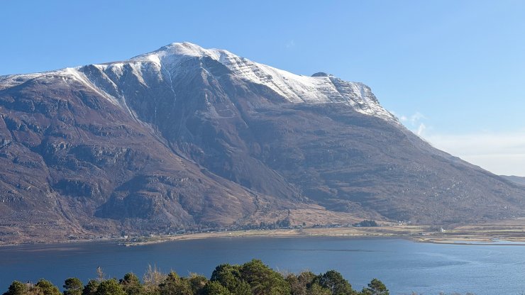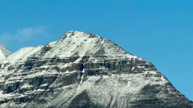 A close up of Liathach showing a thin dusting of fresh snow, mainly lying on bare ground on these aspects